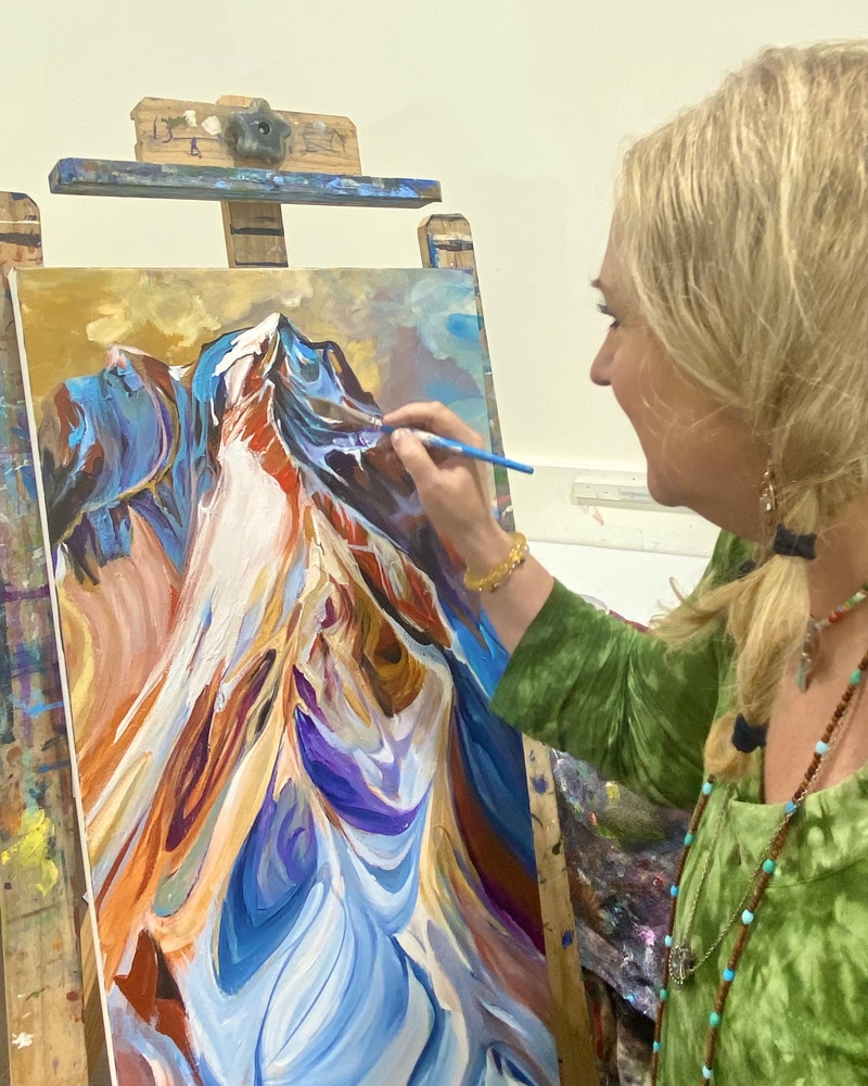 彼女は主にアクリル絵の具を使い、力強い色を重ねながら、カナディアンロッキーのダイナミズムを独自の印象派テイストで表現します。