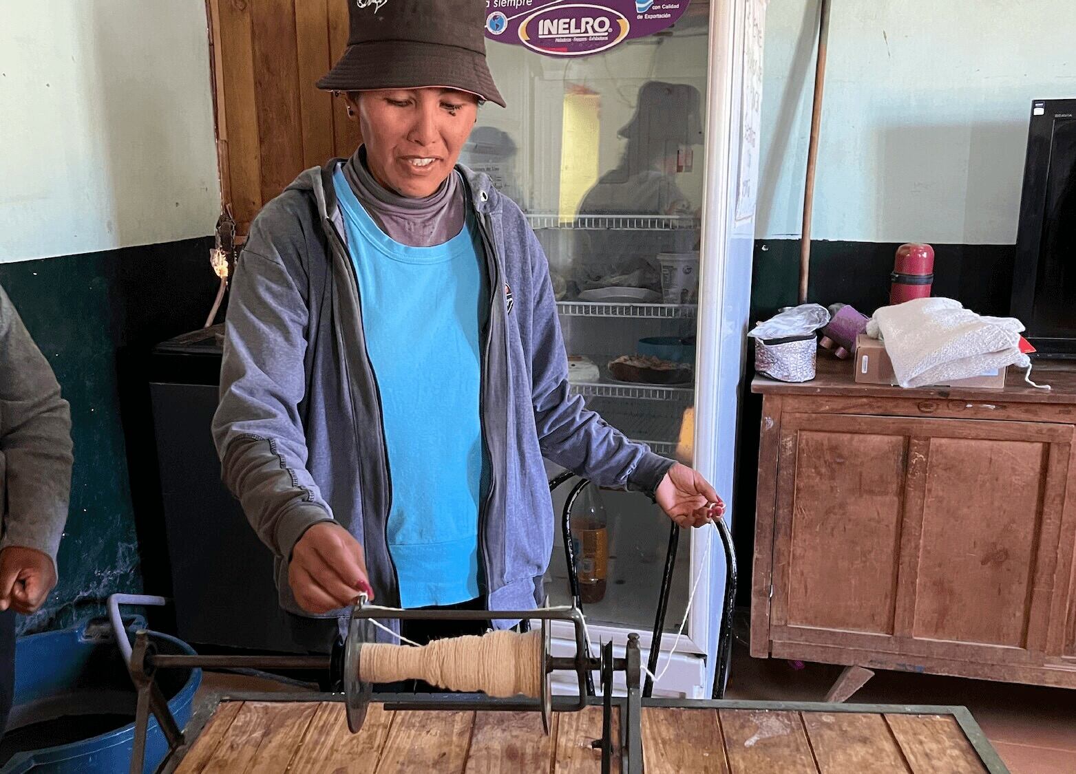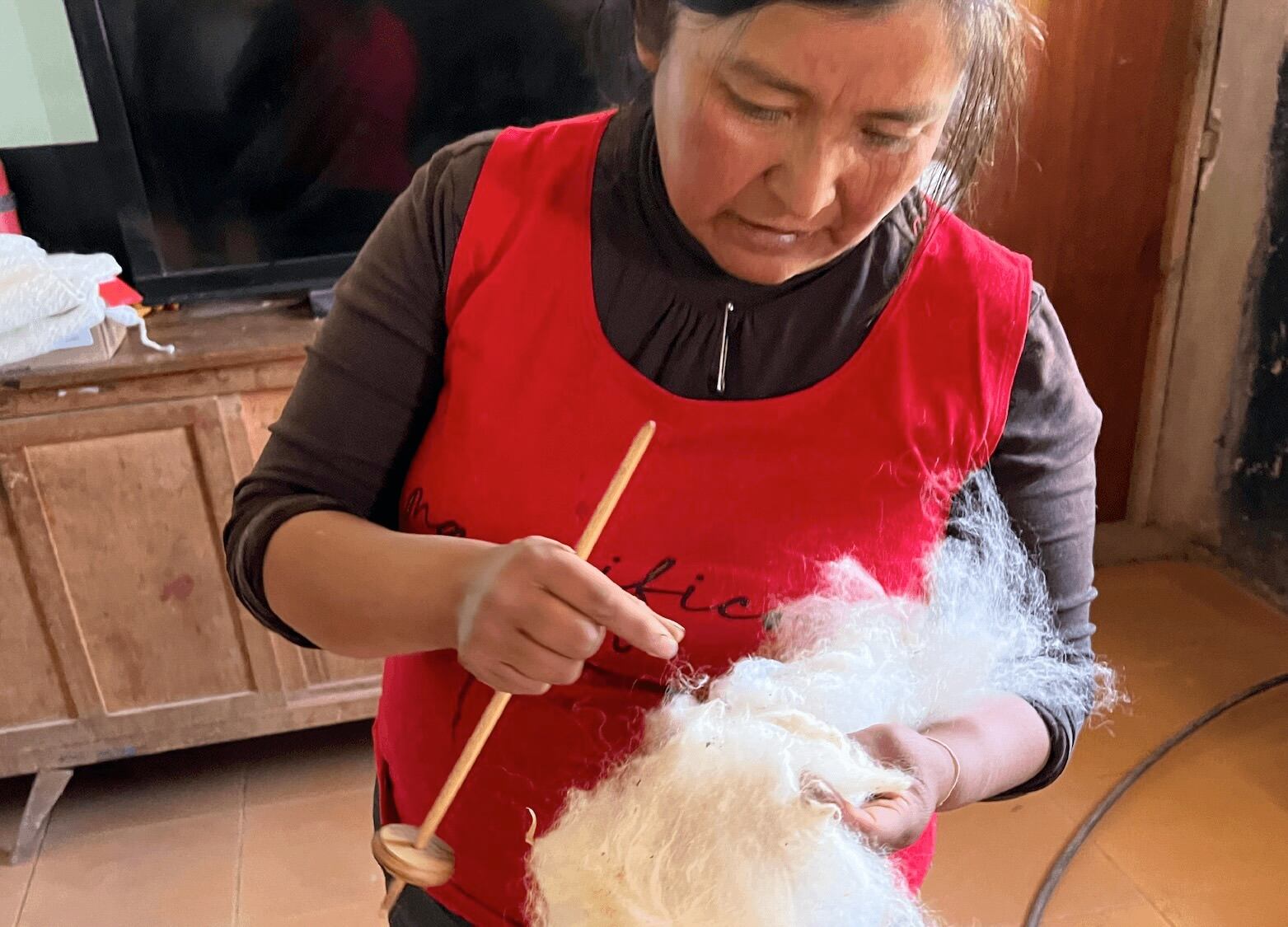 ラマの毛刈りから糸づくり、染色、編み上げまで、すべて手作業。