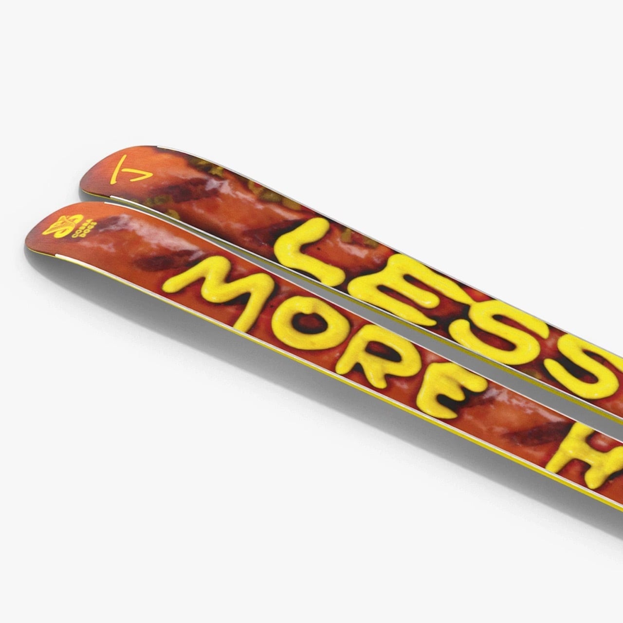だから先端からテールまでリアルなホットドッグ写真を敷き詰めて、マスタードで「LESS SKIING, MORE HOT DOGGIN(スキーよりホットドッグ)」の文字をオン。これは昔ながらのスキー用語へのオマージュであり、フッドの熱いセッションを支え続けるDerrekのホットドッグへのリスペクトだ。