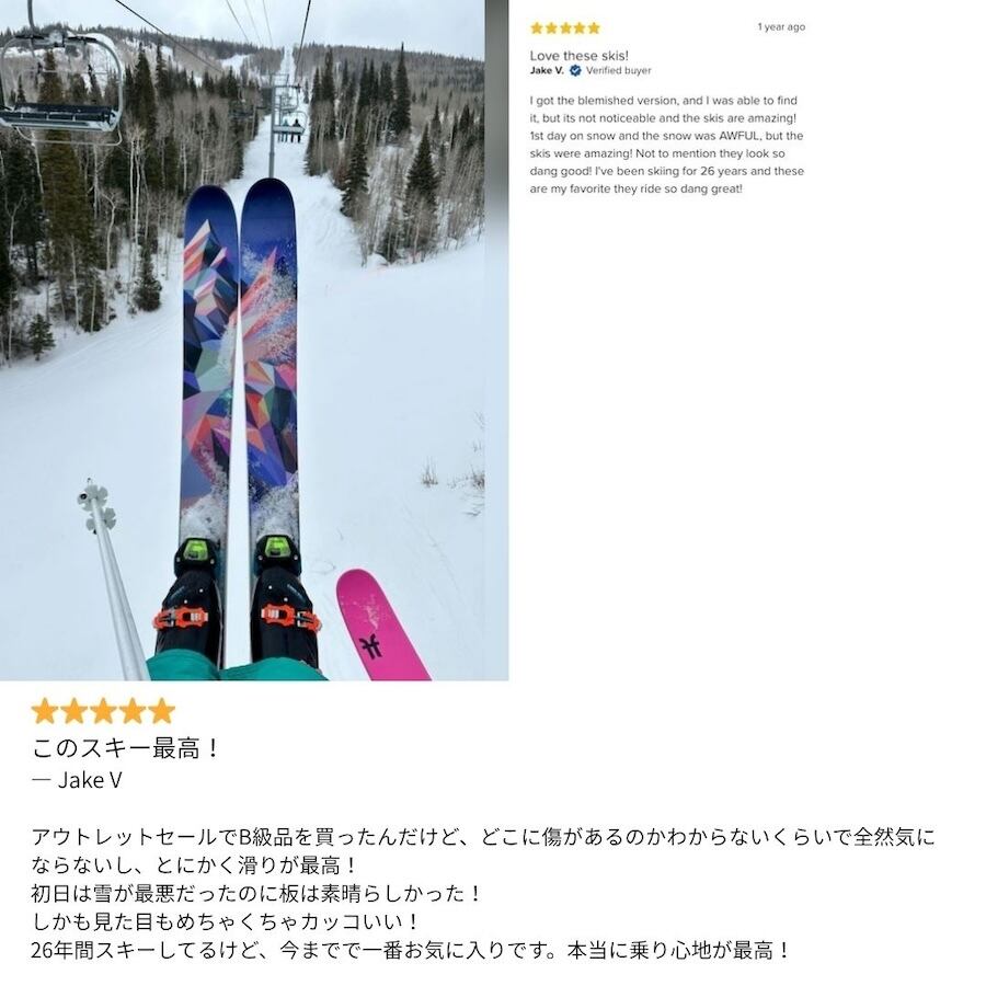 J skisのスキーはすべて少量限定生産のため、人気モデルはシーズン前に完売することがよくあります。ご注文時にメーカー在庫がない場合は、キャンセルとなる場合がございますので何卒ご了承ください。
