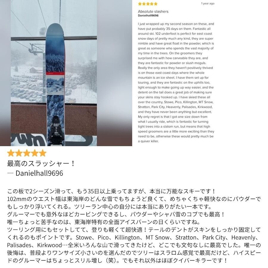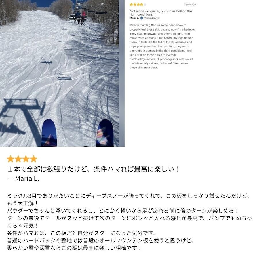 軽くて、スラッシーで、抜群の小回り性能。しっかりした安定感を保ちつつ、アグレッシブなサイドカットでキレのあるカービングもOK。それでいてテールで自在にピボット、スラッシュ、シュミアもできる。まさに今のクリエイティブなフリーライドスキーヤーにぴったり!– Freeskier Gear Lab