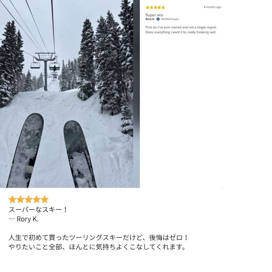 軽量なアスペンコアと、J skisならではのクラシックなダウンヒル構造を組み合わせることで、登りやすさと滑走時の安心感を見事に両立しています。