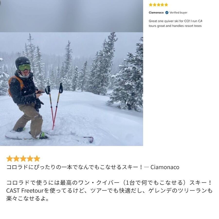 これぞ理想のクロスオーバースキー。軽くて、遊べて、しかも安定してる。ターンの切り返しなんて、あったかいナイフでバター塗るみたいにスムーズ! — Freeskier Magazine