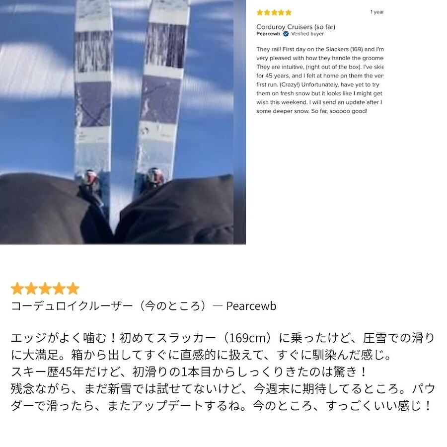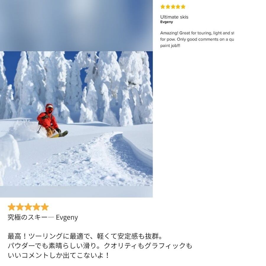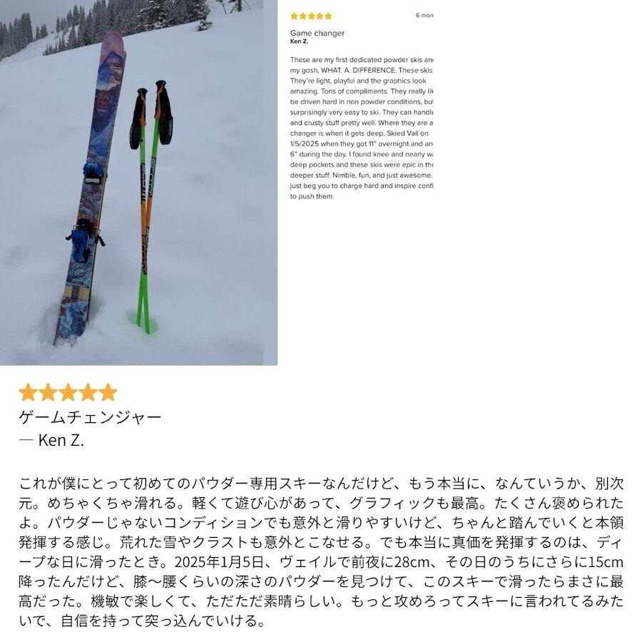 誰でも気軽に乗れて、しっかり曲がって、エッジも効かせられる。とにかく楽しい一日が過ごせるスキー。パウダーを楽に楽しみたい人がいたら、迷わずこれを渡しますね! — SKI Magazine