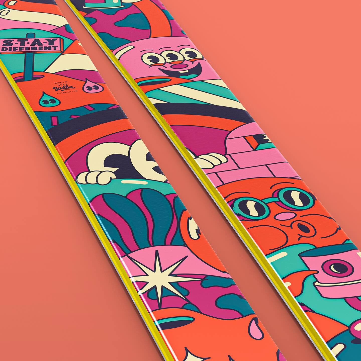 個性的なJ skisのグラフィックに、相性抜群のメタリックカラーのビンディング。