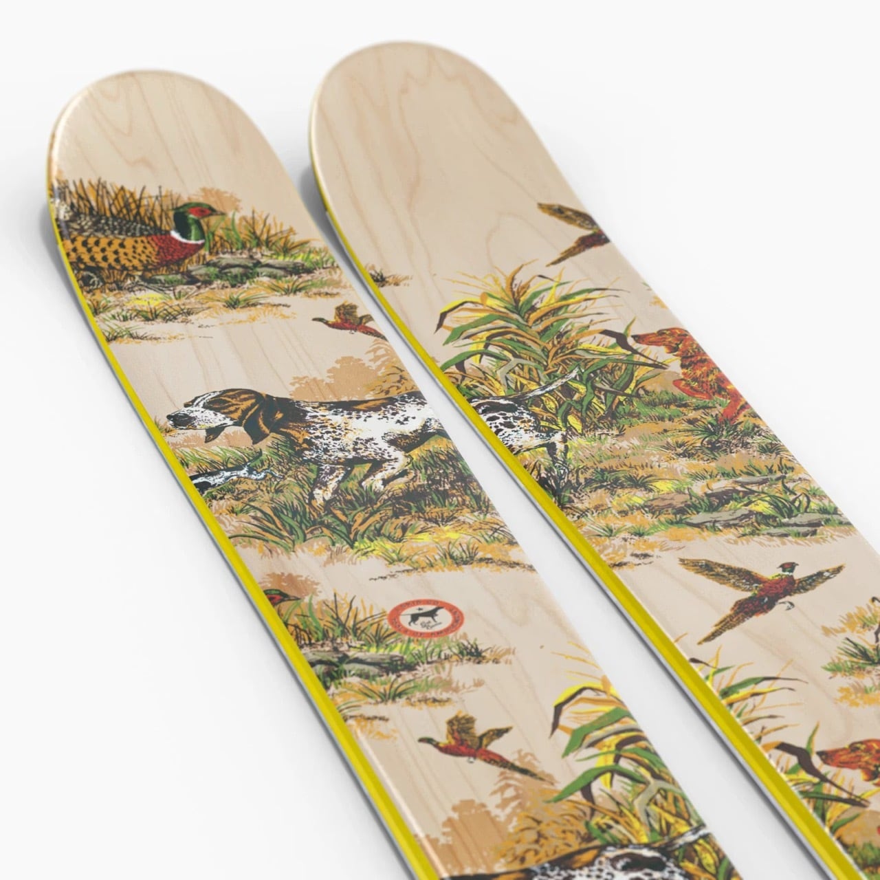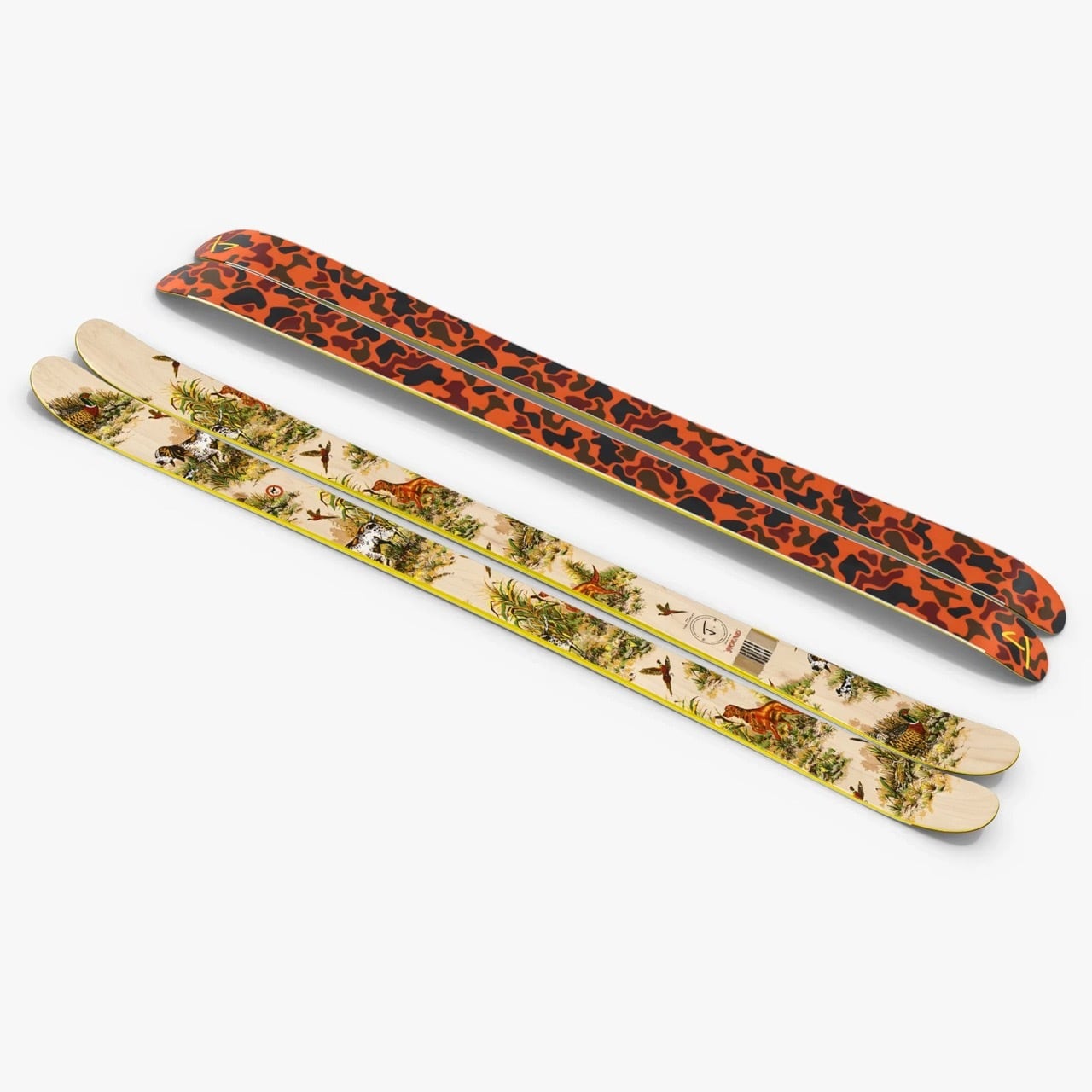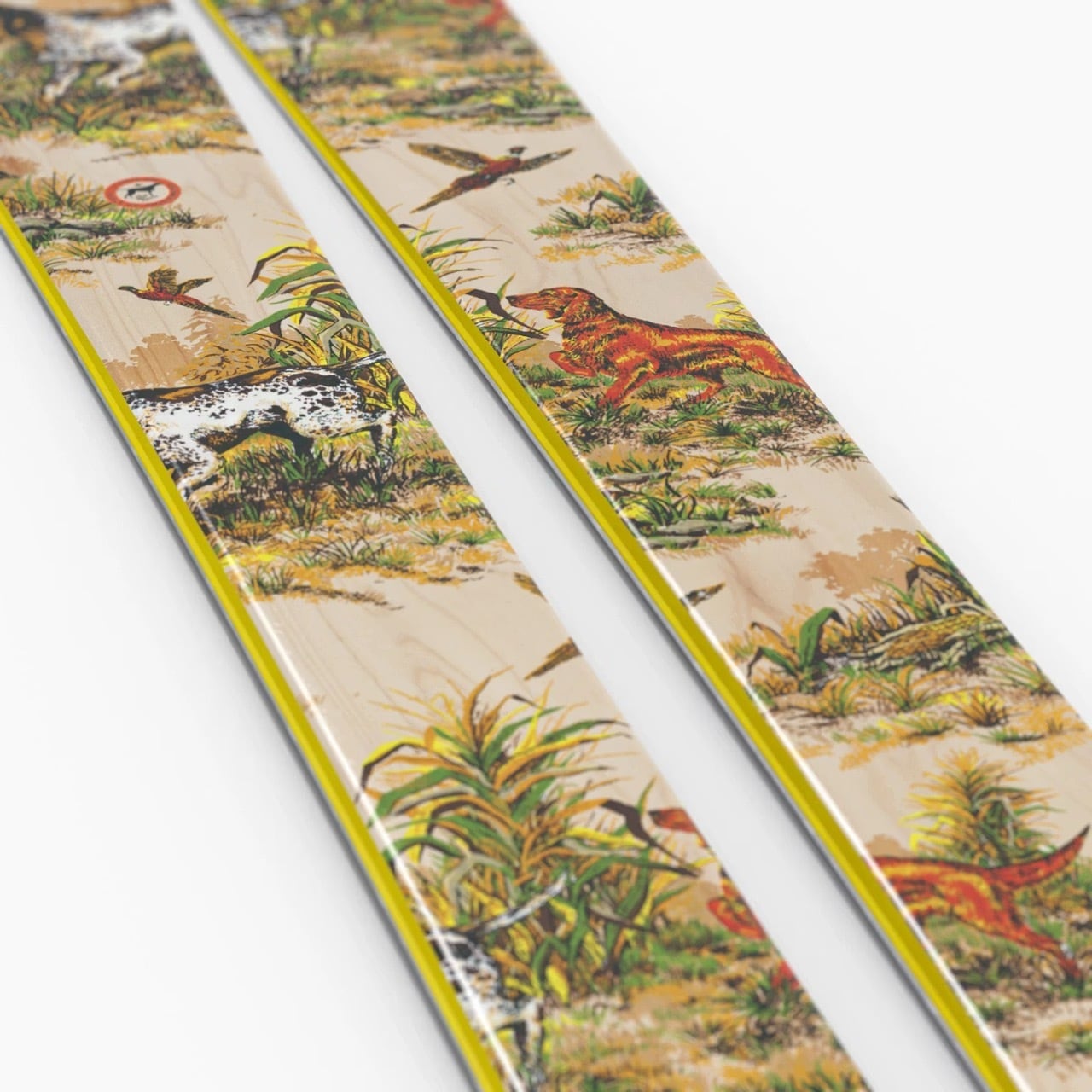 その生地のごく一部から、狩猟犬・キジ・クラシックなアウトドア風景が描かれた柄を丁寧にスキャン&再構築し、スキーのトップにリピートパターンとして落とし込みました。