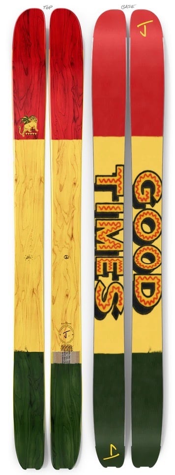 トップシートは自然な木目に半透明の色を重ね、温かくオーガニックな雰囲気を演出。クラシックなレゲエアルバムのようなビンテージスタイルに仕上げました。一方、ベースには大きく「GOOD TIMES」とプリントしました。このスキーなら、パウダーを滑っている時も、その楽しさをしっかりとアピールできます!
