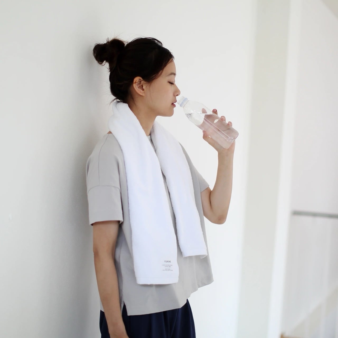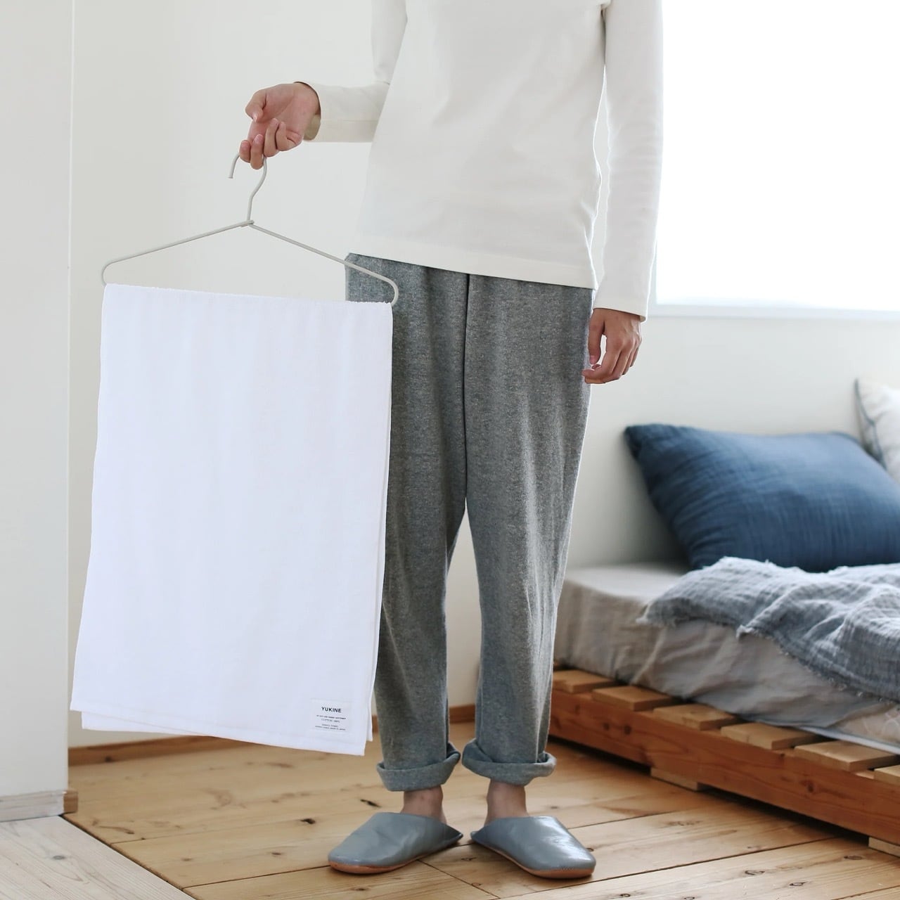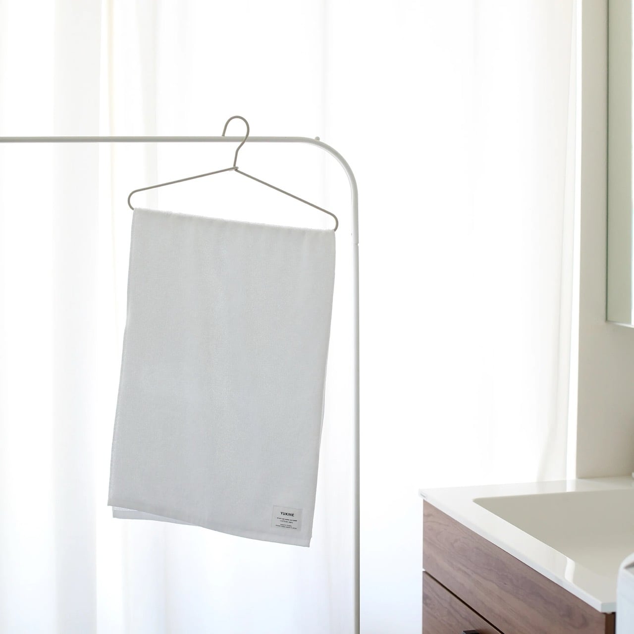 フェイスタオルとバスタオルの中間の大きさの「ミニバスタオル」。YUKINEの高い吸水性によって、コンパクトでありながら、お風呂上がりの水気をしっかりと吸い取ってくれます。また、ハンガーに掛けて干すことができ、省スペースや洗濯量の軽減に役立ちます。
